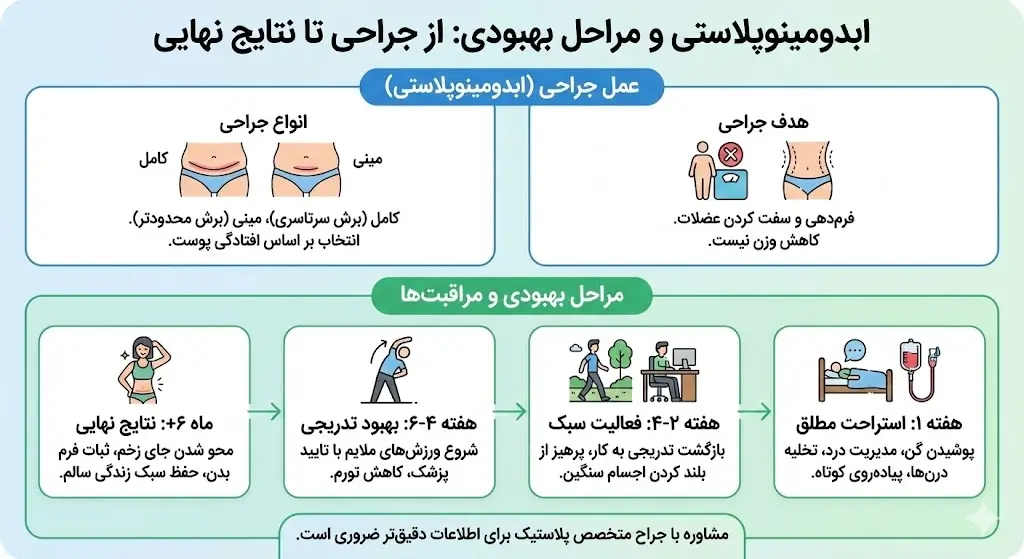 از آنجایی که همه ابدومینوپلاستی ها یکسان نیستند، زمان بهبودی متفاوت است. میزان تشریح، سفتی بسته شدن، نیاز به سفت شدن ماهیچه ها و تا چه حد ممکن است بر درد پس از عمل، احساس سفتی و زمان بهبودی تأثیر بگذارد. با این حال، اکثر بیماران باید بتوانند اکثر فعالیتهای خود را تا 3-6 هفته از سر بگیرند و باید بتوانند در عرض چند روز به حالت ایستاده بایستند. بیمارانی که از خانه کار می کنند احتمالا می توانند پس از هفته اول این کار را انجام دهند.