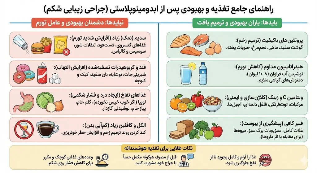 | تاثیر افزایش وزن پس از عمل ابدومینوپلاستی | افزایش وزن میتواند باعث کشش پوست و عضلات شکم شود و در نتیجه سلولهای چربی رشد کنند. این امر میتواند باعث کاهش اثرات مثبت عمل و سفت شدن عضلات و پوست شود. |