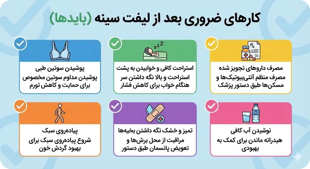 لیفت سینه یک روش جراحی زیبایی است که به منظور جلوگیری از افتادگی سینه و بهبود شکل و جلوه ظاهری آن انجام میشود. پس از لیفت سینه، پزشک پیگیری دقیقی از شما خواهد کرد. ایشان ممکن است ویزیتهای مکرر برای ارزیابی و پیگیری پس از عمل را تعیین کنند.هر عمل جراحی به ریسکها و عوارضی همراه است. مهم است که با پزشک خود در مورد جزئیات و انتظارات خود صحبت کرده و تمامی پیشنهادات پزشکی را رعایت نمایید.
