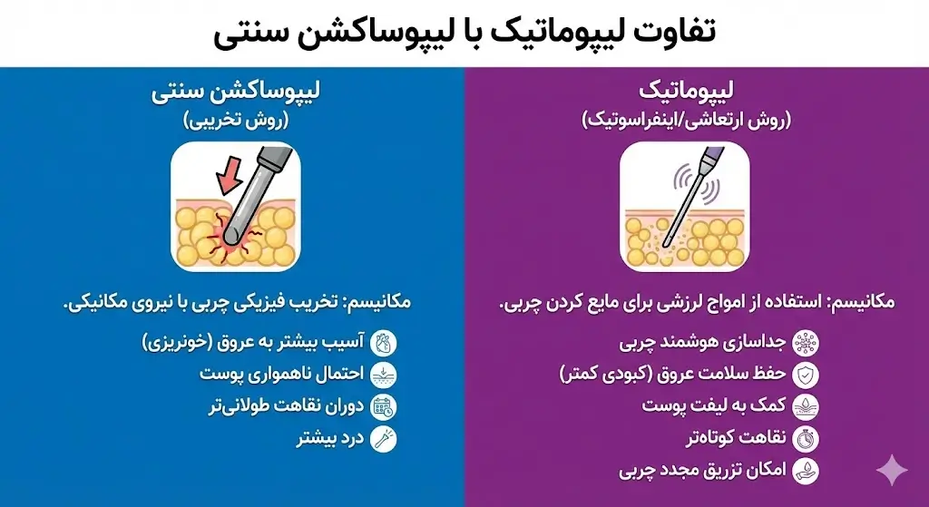 | تأثیر بر سلولیت | فاقد درمان موثر | لیپوماتیک پاکتهای چربی عمیق را درمان میکند و روی سلولیت سطحی اثری ندارد. |