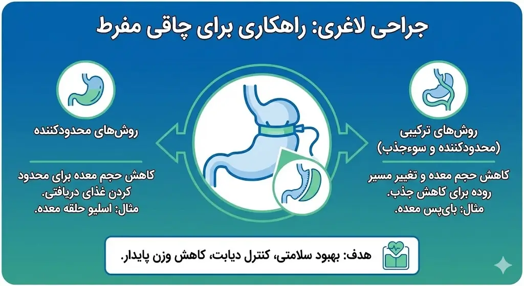 | بایپس کلاسیک (Bypass) | کوچک کردن معده و متصل کردن آن به اواسط روده کوچک. | ۷۰ تا ۸۰ درصد وزن اضافه | ۲ تا ۳ ساعت | استاندارد طلایی برای درمان دیابت نوع ۲ و رفلاکس شدید. | کمبود جذب ویتامینها؛ سندرم دامپینگ (حالت تهوع بعد از شیرینی). |